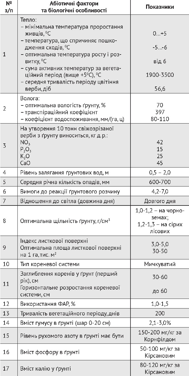 Загалом для створення високопродуктивних плантацій слід враховувати біологічні особливості енергетичної верби та вимоги до ґрунтово-кліматичних умов (табл. 1).
