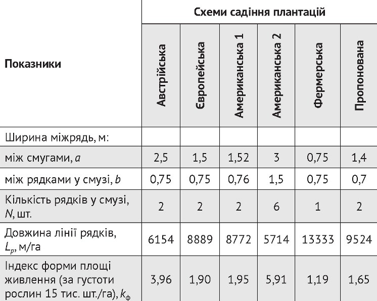 Таблиця 3. Параметри відомих схем садіння енергетичної верби