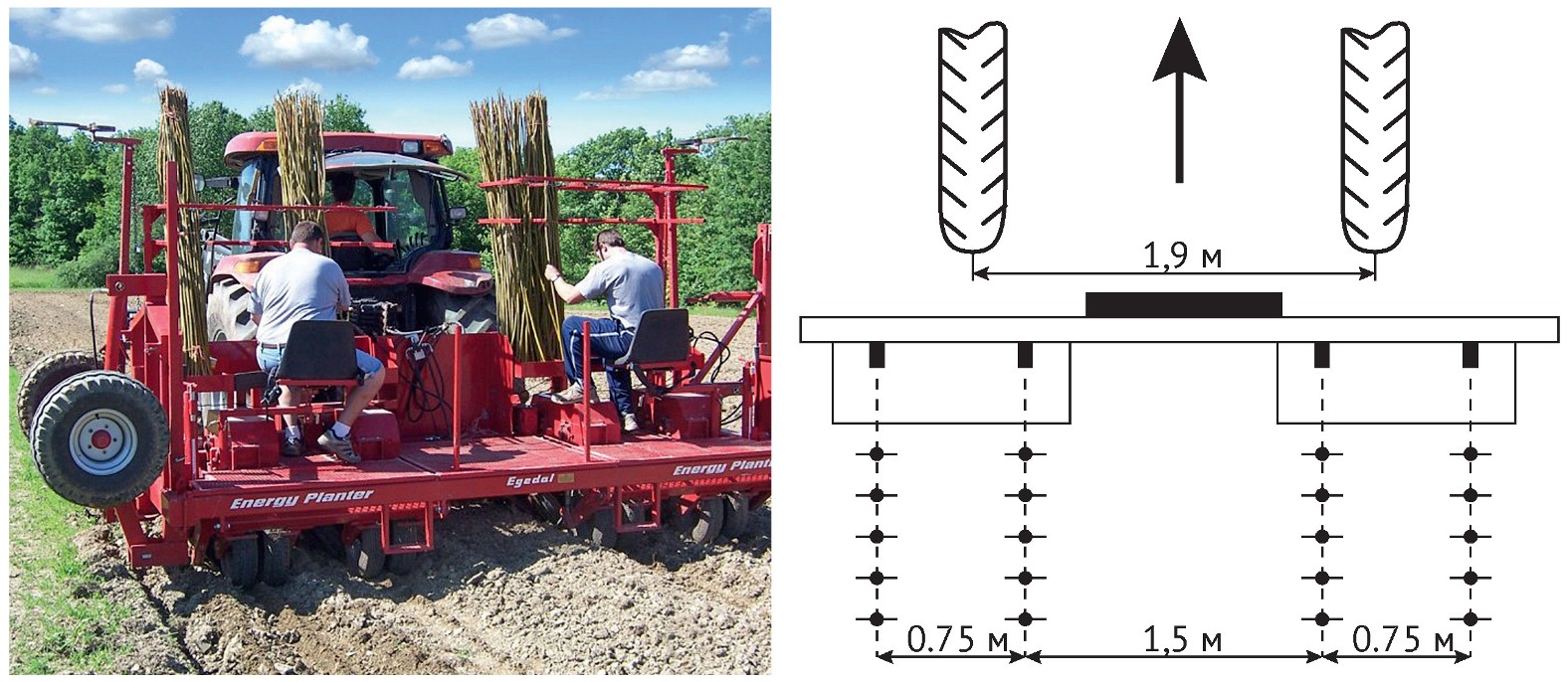 Для садіння живців верби на великих плантаціях нині в Європі розроблено низку спеціальних машин для вирощування і збирання енергетичної верби. Так, 4-рядкова садильна машина Energy Planter датської компанії Egedal (рис. 2) поки є єдиною такого типу, що працює в Україні. Вона використовується для садіння живців енергетичної верби в основному на великих плантаціях (понад 100 га). Важливим є те, що ця машина розрізає вербовий прут на живці безпосередньо під час садіння і заробляє їх у ґрунт з ущільненням його навколо живця, що забезпечує високий відсоток приживання. Продуктивність машини в середньому — 2,5 га/год., що дає можливість за світловий день засаджувати живцями верби до 30 га. Машина висаджує живці за європейською схемою (1,5 х 0,75 м).