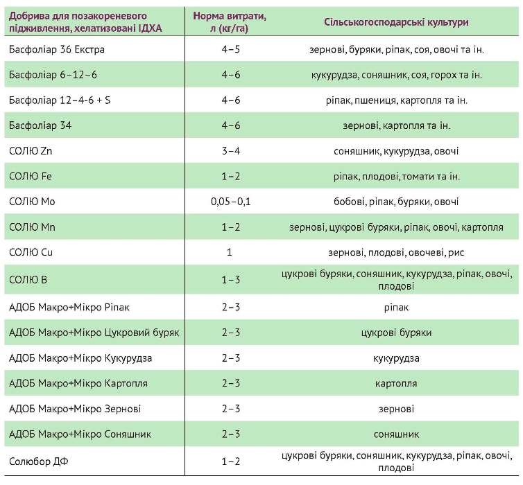 Розроблені професіоналами, з покращеними властивостями, завдяки хелатизації речовиною ІДХА - професійна лінійка рідких мікродобрив «БАСФОЛІАР» та «СОЛЮ» і кристалічних «АДОБ Макро + Мікро» та «Солюбор ДФ» - зайняли лідируючі позиції на ринку України завдяки суттєвим перевагам, які дають можливість отримувати максимальні урожаї, що генетично закладені в насіння сільськогосподарських культур: