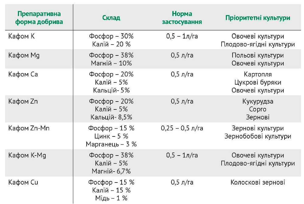Різноманітність лінійки добрив Кафом дозволяє підібрати конкретний препарат під конкретну культуру та відповідну технологію. Справа в тому, що крім активного фосфору, різні формуляції добрива містять калій, магній, кальцій, цинк, марганець, мідь. Відповідно, препаративна форма добрива підбирається для корекції дефіциту цих елементів в загальній технології, або ж під конкретну культуру, чутливу до нестачі певного мікроелементу.