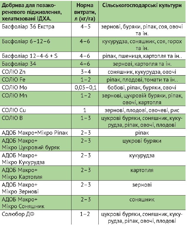 Розроблені професіоналами, з покращеними властивостями, завдяки хелатизації речовиною ІДХА- професійна лінійка рідких мікродобрив «БАСФОЛІАР» та «СОЛЮ» і кристалічних «АДОБ Макро + Мікро» та «Солюбор ДФ» - зайняли лідируючі позиції на ринку України, завдяки суттєвим перевагам, які дають можливість отримувати максимальні урожаї, що генетично закладені в насіння сільськогосподарських культур: