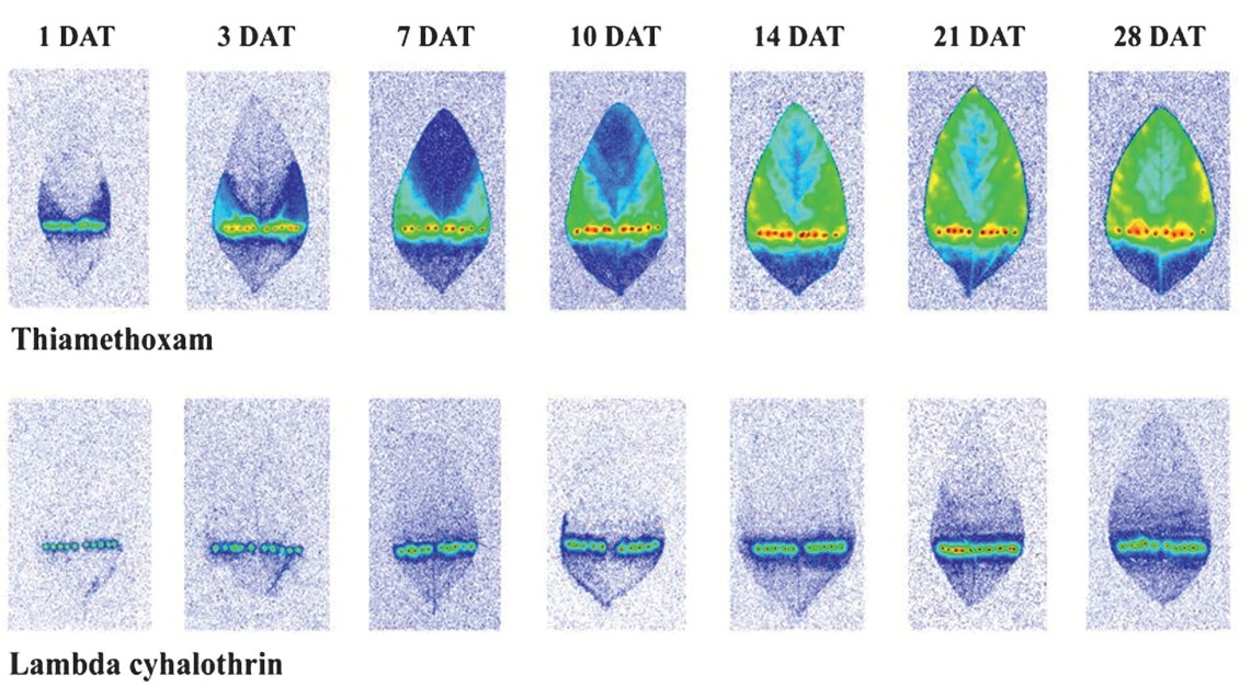 Нині в Україні використовують 5 діючих речовин із класу неонікотиноїдів. Тіаметоксам серед них має найбільшу розчинність у воді - 4,1 г/л. Що це дає? Звичайно, ця властивість тіаметоксаму зумовлює його виняткову системність. Тобто речовина проникає у клітинний сік, стає частиною рослини, рухається від клітини до клітини. На рис. 1 добре видно поширення діючих речовин Енжіо всередині тканин листка за 28 днів після обробки (DAT).