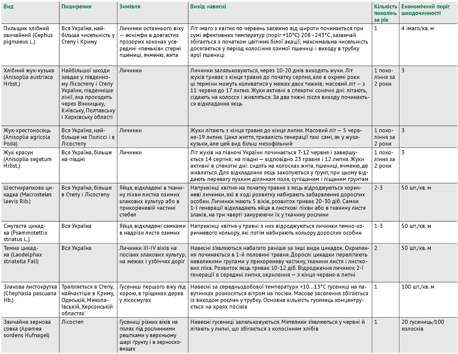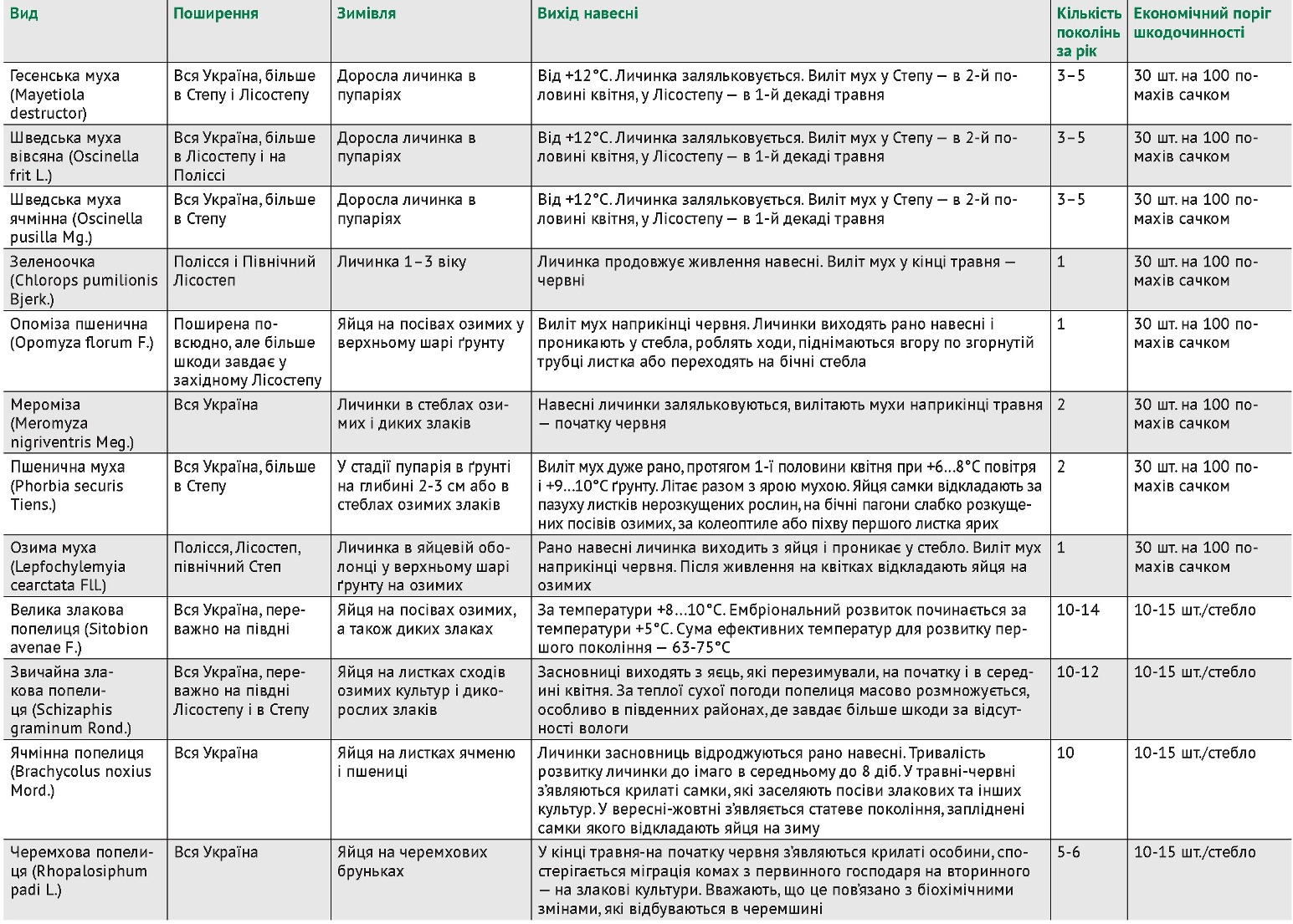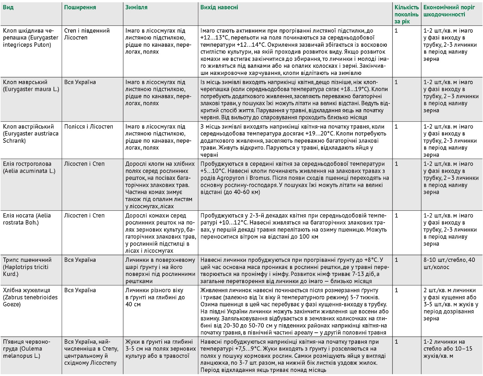 Навесні на посівах озимої пшениці починають живлення після зимівлі клопи, попелиці, окремі злакові мухи, п'явиці та ін. Більшість шкідників виходять, коли середньодобова температура стабільно перевищуватиме +10 °C. За багаторічними даними, це починається з другої декади квітня у південних областях і триває до першої декади травня у північних. Масовий вихід шкідників після зимівлі здебільшого збігається за терміном із початком виходу в трубку озимої пшениці і ячменю. У цей же час зазвичай проводять масові роботи з хімічного захисту посівів проти бур'янів і хвороб.