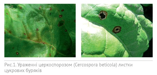 Завдяки такій високій температурі повітря та надмірній вологості цукрові буряки, що були посіяні у період з 15 по 20 квітня, зараз (на середину червня) вже на багатьох полях почали змикати рядки, тобто їхня вегетація трохи прискорилася. З літератури відомо, що така надзвичайно шкодочинна хвороба, як церкоспороз з’являється на листках культури в середині липня-на початку серпня, але з огляду на природні умови цієї весни і таке швидке наростання вегетативної маси солодких коренів захворювання може виникати набагато раніше, не дивлячись на заявлену до нього начебто толерантність гібридів відомих світових виробників (рис. 1).