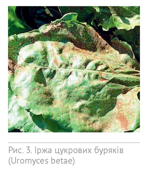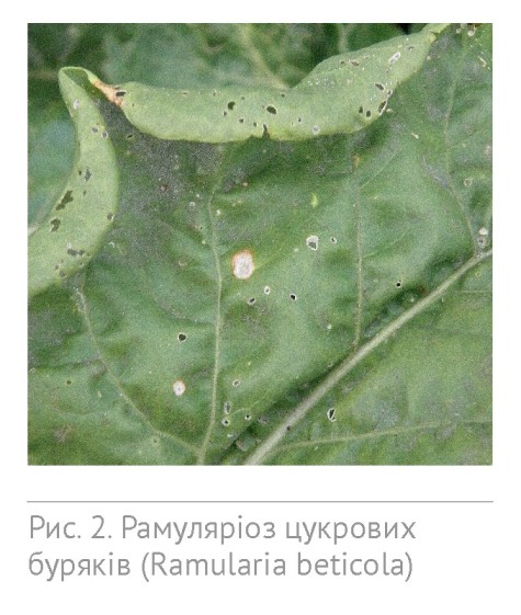 Також варто зазначити, що завдяки погодним умовам, які склалися цього року, можливий розвиток таких хвороб листкового апарату, як рамуляріоз та іржа. За зовнішнім проявом рамуляріоз подібний до церкоспорозу, проте при зараженні ним на листках утворюються плями менш правильної форми, які поступово збільшуються у розмірі. Бура середина з темно-бурою облямівкою, як при церкоспорозі, як правило, відсутня, плями зазвичай покриті білим порошкоподібним нальотом (рис. 2). Друга хвороба – іржа – може проявлятися значно раніше, ніж церкоспороз і навіть борошниста роса. Уражує черешки та листя, спостерігається в травні-липні у вигляді опуклих плям жовтогарячого кольору (рис. 3).