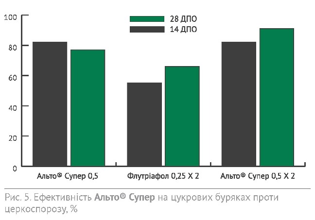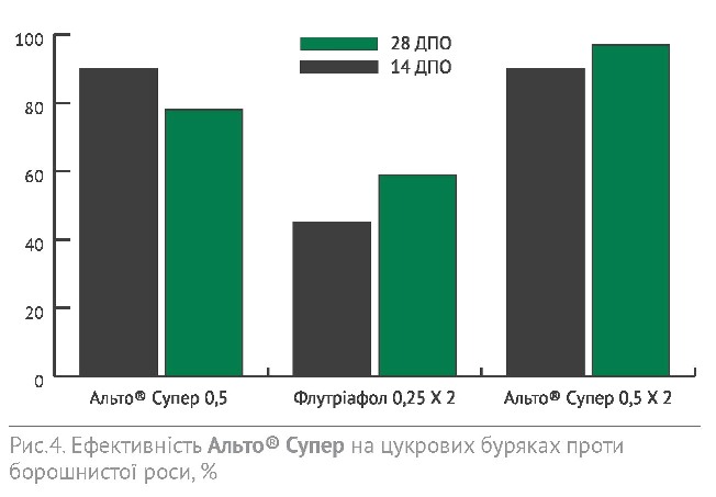Цукрові буряки – це, звісно, не пшениця, тут агроном ходить по полю кожен день. Після таких дощів треба уважно придивлятися до листкової поверхні буряків і тільки-но побачите окремі плями церкоспорозу, одразу слід застосовувати фунгіциди. При цьому інтервал між виявленням хвороби та виходом обприскувача в поле повинен становити не більше декількох годин. Деякі агрономи старшого покоління ще й досі висівають на полі між рядками цукрових буряків декілька рядків столового, який є своєрідною сигнальною рослиною, оскільки уражується церкоспорозом на декілька днів раніше. Це хоч і давній, але дієвий захід попередження розвитку церко-спорозу на полі. Для запобігання поширенню хвороби обприскувач повинен обробити посіви цукрових буряків на наступний день після виявлення уражень листової пластинки столового буряка. Альто®Супер у нормі внесення 0,5 л/га здатний швидко зупинити церкоспороз, борошнисту росу та іржу, коли хвороби вже з‘явилися на полі та ураження листкової поверхні становить 5-10%. При цьому він працює значно краще, ніж більш дешеві інші азоли, навіть внесені двократно (Рис. 4-6).