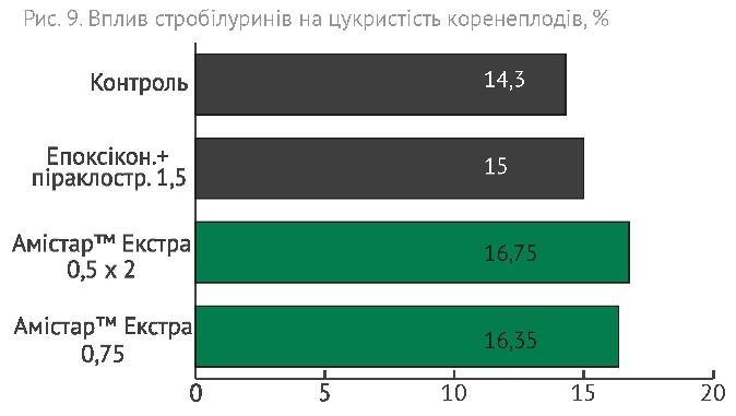 Крім того, так само як, наприклад, на пшениці Амістар™ Екстра справляє так званий зелений ефект – рослини цукрових буряків мають кращий темно-зелений колір та захищені достатньо тривалий період від основних хвороб, що сприяє отриманню кращого врожаю.