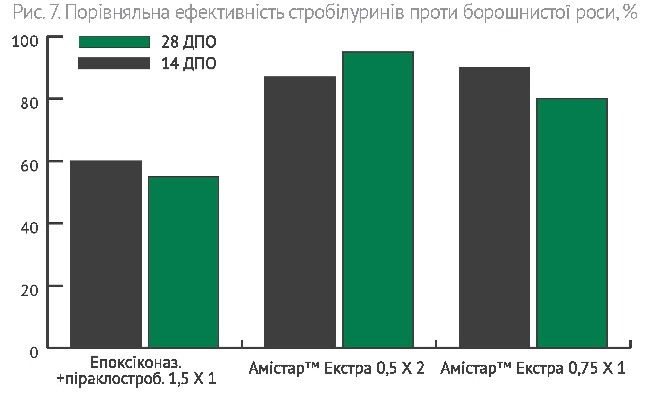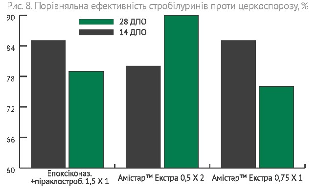 Інший фунгіцид – Амістар™ Екстра – один із перших та відомих препаратів стробілуринової групи фунгіцидів, який на цукрових буряках завжди застосовується як превентивний захід. На відміну від Альто®Супер, Амістар™ Екстра використовується для запобігання ураженню листкової поверхні цукрових буряків хворобами. Але завдяки ципроконазолу, що входить до його складу, Амістар™ Екстра має також і лікувальну дію при перших симптомах хвороби. Обидві діючі речовини препарату – ципроконазол та азоксистробин – є найсистемнішими на ринку, саме тому превентивна та лікувальна дії в них найбільш виражені (Рис. 7-9).