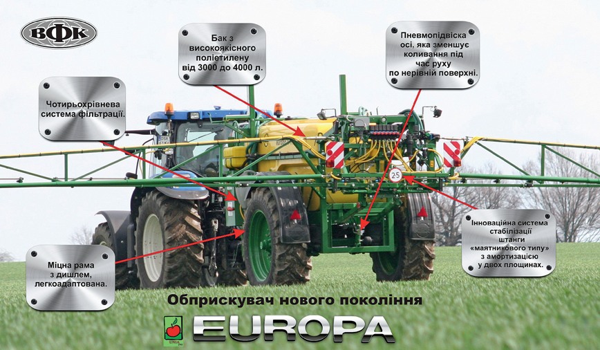 Саме тому дуже важливим є вибір обприскувача, який повинен бути ВИСОКОпродуктивним, ВИСОКОнадійним, НАДсучасним та при цьому ВИСОКОрентабельним. Щоб відповідати цим параметрам, і була створена EUROPA, яка стандартно оснащується наступними вузлами: