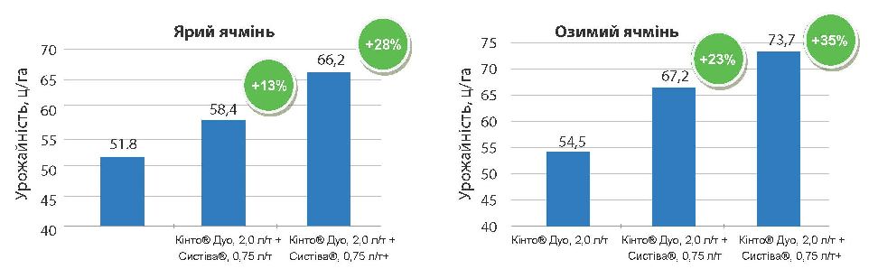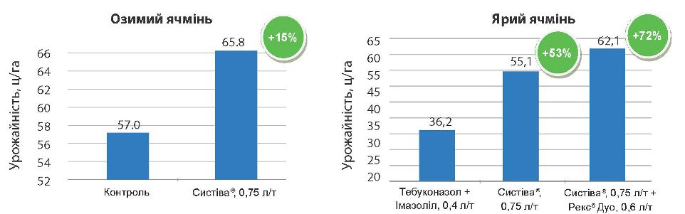 Високу ефективність передпосівної обробки насіння фунгіцидом Систіва® відмічають і білоруські науковці Інституту захисту рослин. За їхніми даними, використання фунгіциду Систіва® з нормою витрати 0,75 л/т дозволяє підвищити урожайність озимого ячменю майже на 9 ц/га, або на 15%. Не менш ефективною є обробка насіння ярого ячменю. Так, в умовах СПК «Ольговське» (Білорусь) використання Систіва®, 0,75 л/т забезпечило підвищення урожайності ярого ячменю сорту Батька на 18,9 ц/га, або на 52%. Водночас поєднання протруювання насіння препаратом Систіва® з наступним внесенням фунгіциду Рекс® Дуо, 0,6 л/га у фазі початку виходу колосу (ВВСН 49-51) дало можливість додатково отримати майже 26 ц/га зерна ярого ячменю (рис. 5).
