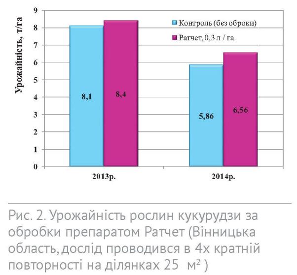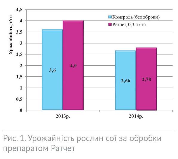 Проведено ряд досліджень, упродовж 2013–2014 років зі встановлення ефективності препарату Ратчет за листкового нанесення на рослини сої та кукурудзи в умовах Правобережного Лісостепу (Вінницька область; у 2014 році Вінниницький район м. Бохоники дослід проводився в 4-кратній повторності на ділянках 25 м2, які розміщені рендомізовано; у 2013 році Хмільницький район село Кушелівка, в 4-кратній повторності на ділянках 25 м2, які розміщені рендомізовано; лабораторні виміри незалежно від року досліджень проводили в 4-кратній повторності, при вимірюванні кожного показника). Оброблення рослин препаратом Ратчет проводили під час вегетації дослідних культур, а саме у фазі 4–6 справжнього листа для кукурудзи і 3–6 трилистників для сої. Рослини обприскували приготованим розчином препарату Ратчет з розрахунку 0,3 л/га кукурудзи та сої. Використання препарату Ратчет у технології вирощування сої показало позитивні результати відносно росту та розвитку рослин. Так, порівнюючи дослідний варіант з контролем де не проводилось ніякої обробки, висота рослин зростала в середньому на 7 см, кількість бобів з 1 рослини збільшувалася на 3-5 шт., також спостерігали зростання маси 1000 насінин. Найбільш важливим показником, що характеризує рівень продуктивності культури є її урожайність та якість насіння. Урожайність сої коливалась рік від року, але у середньому приріст урожаю при застосуванні препарату Ратчет була у межах від 0,12 т/га до 0,4 т/га порівняно з контролем (рис. 1).