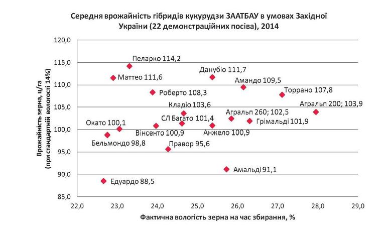 На графіку, розміщеному нижче, наведена середня урожайність гібридів кукурудзи ЗААТБАУ (в перерахунку на стандартну вологість зерна 14%), яку вони продемонстрували на 22 випробувально-демонстраційних ділянках господарств Західної України в 2014 році.