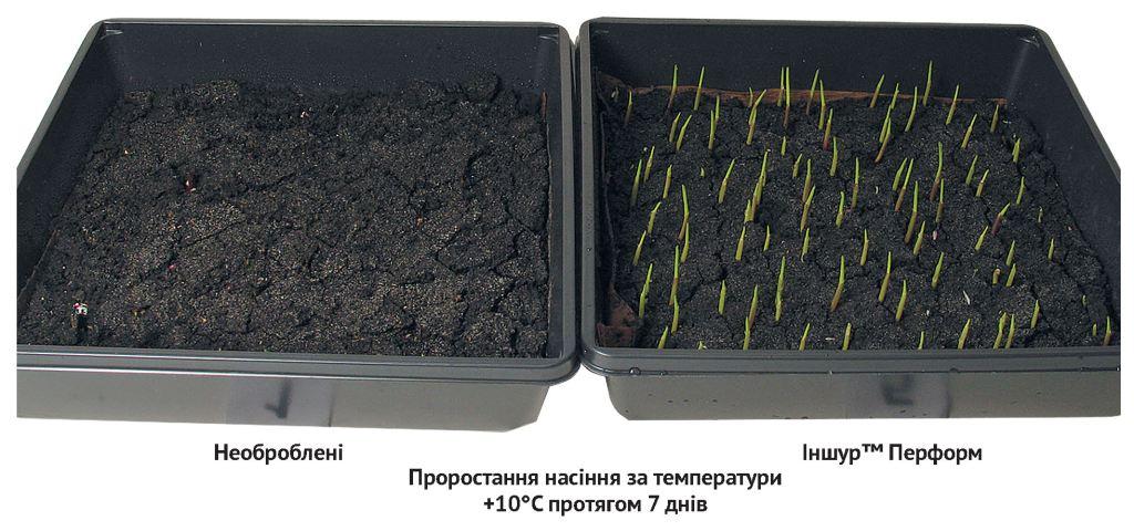 У посушливих умовах або за пізніх строків сівби, завдяки позитивному впливу Іншур®Перформ на фізіологічні процеси в проростку, ми взмозі отримати вирівняні та дружні сходи за більш короткий період часу, а також стимулювати подальший розвиток рослин, підвищити їх стійкість до несприятливих умов під час перезимівлі. Це дозволить їм увійти взиму у задовільному стані, а навесні своєчасно відновити вегетацію. Крім того, Іншур®Перформ забезпечує якісний контроль найбільш поширених патогенів: летюча і тверда сажки, септоріоз, плямистості.