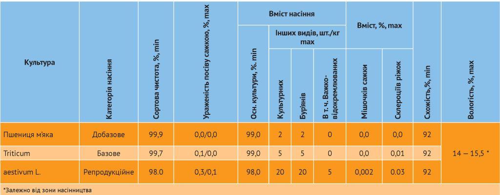 Таблиця 1. Вимоги до якості насіння м’якої пшениці згідно з ДСТУ 2240 1993