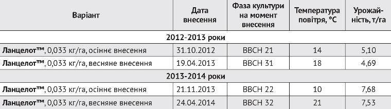 Таблиця. Результати досліджень з осіннього застосування Ланцелот™