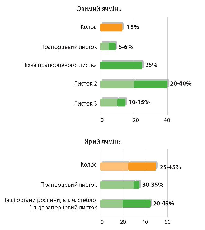 Найбільшої шкоди фотосинтетичній продуктивності посівів ячменю завдають сітчаста, смугаста і темно-бура плямистості, ринхоспоріоз, борошниста роса, кореневі гнилі тощо. Недобір врожаю у результаті ураження хворобами в середньому становить 20-30%, однак за епіфітотійного поширення може сягати 50-60% і більше. Ефективна система захисту в сучасних умовах господарювання стає більш важливим елементом технології вирощування ячменю ніж навіть система удобрення. Адже від фізіологічного стану рослин напряму залежить засвоєння ними елементів живлення, вологи і перетворення їх у процесі фотосинтезу у запасні речовини зернівки, тобто урожай. Також потрібно пам’ятати, що пивоварні якості зерна ярого ячменю залежать від фотосинтетичної продуктивності колоса, прапорцевого і підпрапорцевого, третього листків, адже вони головним чином відповідають за налив зерна, його виповненість (натуру) протягом періоду цвітіння-воскова стиглість (рис. 1). А от рівень урожайності визначає функціонування всього листо-стебельного апарату як на початку вегетації — закладка продуктивних пагонів, так і на завершення — озерненість колоса, маса 1000 зерен. Зменшення площі фотосинтетичної поверхні в результаті ураження хворобами досить часто є причиною редукування продуктивних пагонів, абортивності колосків у колосі, квіток у колосках та формування щуплого зерна. Тому лише комплексний підхід до системи захисту посівів ячменю від сівби до біологічної стиглості є запорукою успіху.