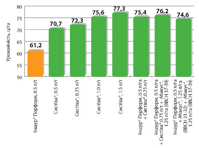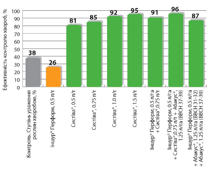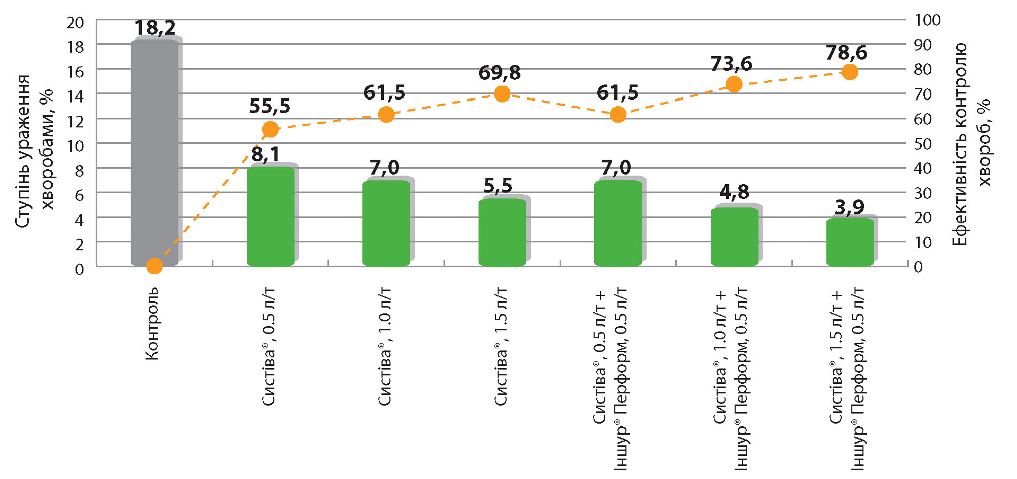 Слід зазначити, що за ефективністю контролю поширення хвороб всі системи захисту були орієнтовно на одному рівні. Однак посіви, де була присутня Систіва®, мали краще розвинуту кореневу систему, закладали більшу кількість продуктивних пагонів, що дозволило отримати на 5-15% вищу урожайність у порівнянні з традиційними інтенсивними системами захисту.