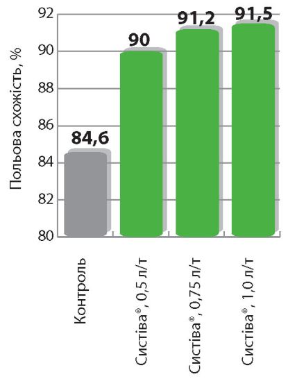У ході реєстраційних досліджень на базі Інституту захисту рослин НААН в умовах Хмельницької області використання Систіва® дозволило підвищити польову схожість посівів озимого ячменю майже на 7%. Якщо врахувати, що норма висіву становила 4 млн схожих насінин/га, то це додаткових 280 тис. рослин/га (рис. 6) або потенційно 3-7 ц/га зерна, залежно від умов вирощування.