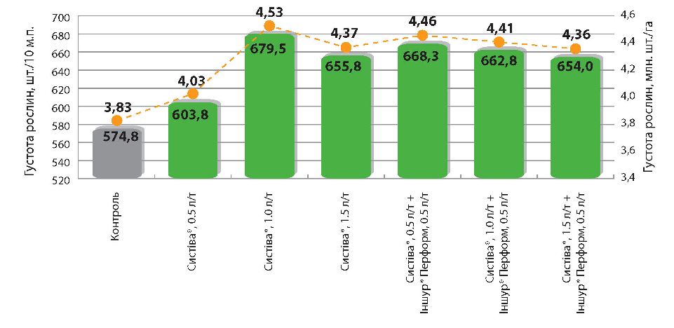 Рис. 7. Вплив Систіва® на густоту рослин ярого ячменю,