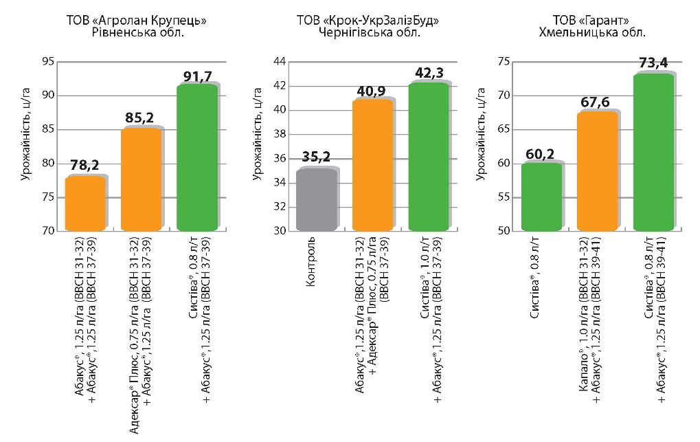 Високу ефективність систем захисту від хвороб, де внесення фунгіцидів у період кущення-початок виходу в трубку було заміщено передпосівною обробкою насіння препаратом Систіва®, підтверджено у численних виробничих дослідах (рис. 8).