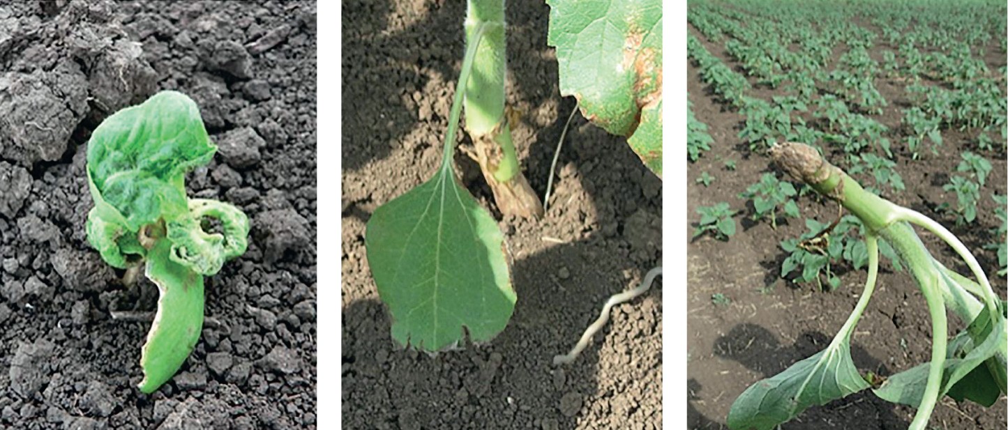 Вибір гербіциду залежить від типу вирощування та очікуваного врожаю. Так, при екстенсивній технології вирощування соняшнику для захисту від однорічних злакових та дводольних бур’янів можна використати бакову суміш Трофі 90 ЕС, к. е. та Гезагард 500 FW, к. с. Але слід пам’ятати, що не можна допускати перевищення норми витрати Трофі, бо це може призвести до виникнення фітотоксичності. Головними ознаками фітотоксичності ацетохлорів на соняшнику є: слабий розвиток бічної кореневої системи, деформування рослин культури, відставання у розвитку (рис. 1).