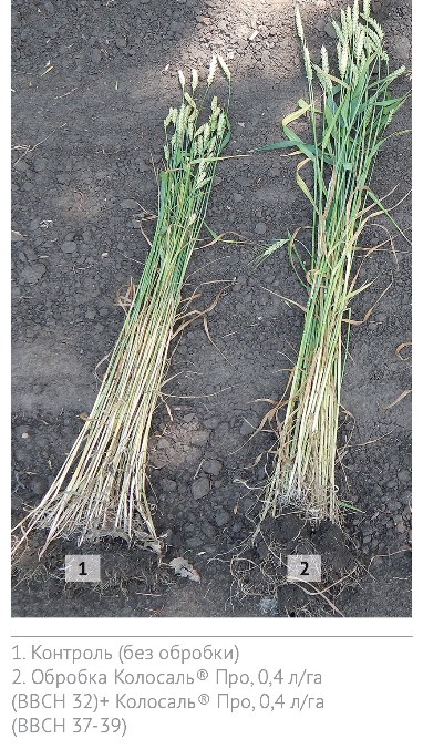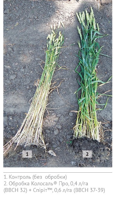 У фазі 2 міжвузля (BBCH 32) в усіх досліджуваних варіантах застосовували фунгіцид Колосаль® Про (пропіконазол, 300 г/л + тебуконазол, 200 г/л) з нормою витрати 0,4 л/га, а у фазі прапорцевого листка (BBCH 37-39) в першому варіанті — Колосаль® Про — 0,4 л/га, а в другому Спіріт™ — 0,6 л/га.