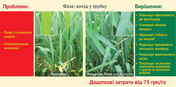 Застосування препарату Фульвітал Плюс (дефіцит-коректор елементів живлення) на озимих зернових у фазі вихід у трубку допомагає покращити живлення рослин та посилити дію фунгіцидів. Кожний із 12 етапів органогенезу, які проходять озимі зернові від сівби до повної стиглості, є важливою і невід’ємною складовою формування високого та якісного врожаю. Тому спостерігаючи за фенологічними фазами росту, їх інтенсивністю, можна за допомогою технологічних прийомів регулювати елементи продуктивності рослин у запрограмованому напрямі.