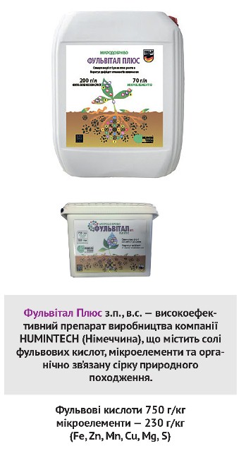 Обприскування по вегетації рослин препаратом Фульвітал Плюс з.п., в.с. стимулює обмінні процеси, тому різко зростає потреба рослини в додатковому мінеральному живленні. Посилюється ріст кореневих волосків і відповідно кількість кореневих виділень, у тому числі і лимонної кислоти, яка хелатує макро- та мікроелементи в прикореневій зоні. Лимонна кислота реагує із важкодоступними сполуками заліза, магнію, кальцію, міді, цинку та інших мікроелементів, утворюючи хелати, які відмінно поглинаються рослиною, що збільшує коефіцієнт засвоєння внесених добрив, макро-, та елементів з ґрунту. Покращується синтез цукрів, амінокислот, гормонів. Підвищується ефективність використання води, таким чином, поліпшується продуктивність рослин.