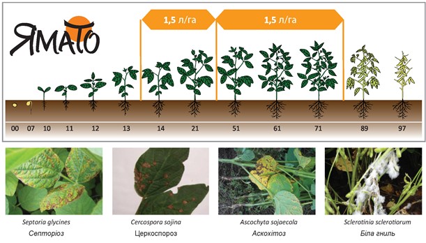 Враховуючи важливість цієї культури та необхідність вдосконалення наявних технологій захисту, компанія ТОВ «Самміт-Агро Юкрейн» почала реєстрацію лінійки нових препаратів для сої, одним із яких є новий фунгіцид Ямато, СЕ. Це сучасний інноваційний препарат, що як найкраще підходить для захисту сої, адже він здатен контролювати цілий комплекс складних хвороб і може застосовуватися протягом усього періоду вегетації. Ямато, СЕ контролює не лише септоріоз та церкоспороз, а й фузаріоз, антракноз, гнилі та борошнисту росу. Ямато, СЕ є вдалим поєднанням двох діючих речовин із різних хімічних груп, що мають різні механізми дії на патогени та володіють високою системною і трансламінарною активністю. Діючі речовини проникають у листя, молоді стебла та боби і рівномірно захищають оброблену рослину протягом двох тижнів. Препарат може застосовуватися як профілактично, так із лікувальною метою на початкових стадіях розвитку хвороб сої.