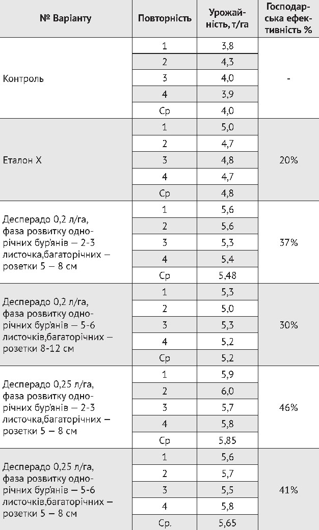 У разі застосування пестицидів проти шкідливих об’єктів найбільш важливим є не лише біологічна ефективність препарату, а й його господарська ефективність. За результатами випробовувань Десперадо® у виробничих умовах ми визначили, що найвищий рівень збереження врожаю є за умови застосування препарату з нормою витрати 0,25 л/га та у фазі розвитку однорічних широколистих бур’янів 2-3 листочки та багаторічних із розеткою 5-8 см (див. табл.).