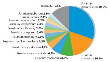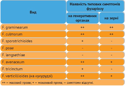 Для розуміння ситуації наведемо декілька науково доведених фактів, які вдалося відшукати при опрацюванні спеціалізованої літератури. Для прикладу: досить часто, коли мова заходить про збудники фузаріозу колоса, оперують загальною назвою роду грибів Fusarium spp. або деталізують, посилаючись на два найбільш поширених у посівах озимої пшениці види: F. graminearum і F. culmorum. Однак видів грибів, які здатні викликати фузаріоз колоса, значно більше, при цьому кожен з них синтезує різні мікотоксини і може викликати або симптомне, або безсимптомне інфікування (рис. 1, табл. 2).
