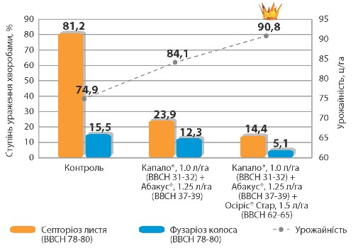 З метою контролю хвороб колоса, зокрема фузаріозу і плямистостей листя озимої пшениці, компанія BASF рекомендує використовувати сучасний фунгіцид широкого спектру дії Осіріс® Стар з нормою витрати 0,75-1,5 л/га. Завдяки поєднанню двох високоефективних діючих речовин з групи триазолів в інноваційній препаративній формі на основі полімерів, фунгіцид забезпечує швидку лікувальну дію та тривалий превентивний захист від фузаріозу і септоріозу колоса, септоріозу листя, видів іржі, піренофорозу та інших плямистостей, перешкоджає розвитку вторинної інфекції (сапрофітних грибів) за розтягнутого періоду збирання або несприятливих погодних умов.