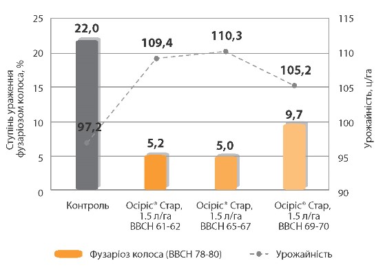 Згідно з результатами досліджень, оптимальним часом внесення Осіріс® Стар є початок і середина цвітіння (ВВСН 61-65). Застосування фунгіциду у цей період обумовило зниження в чотири рази ступеня ураження рослин фузаріозом колоса, що дозволило запобігти втратам 12,2-13,1 ц/га зерна. Зміщення фунгіцидної обробки на кінець цвітіння хоча і дозволило майже вдвічі зменшити ураження рослин фузаріозом колоса, однак було менш ефективним, ніж раннє внесення. Це стало причиною недобору 5 ц/га зерна озимої пшениці.
