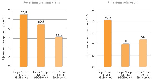 Ефективність такого підходу було підтверджено і у дослідах на інфікованих фонах, які проводилися під керівництвом відомого фітопатолога, доктора с.-г. наук, професора Бабаянц О.В. на базі науково-виробничої фірми «Фунгі» (Одеська область) в 2015 році. Поряд із визначенням оптимального часу застосування фунгіцидів для контролю фузаріозу колоса, метою досліду було підтвердити високу ефективність Осіріс® Стар щодо головних збудників фузаріозу колоса озимої пшениці Fusarium graminearum і F. culmorum в умовах українських реалій (рис. 5). В результаті було доведено високу фунгіцидну активність Осіріс® Стар проти F. graminearum і F. culmorum. При цьому найвищі показники ефективності контролю цих збудників було отримано за обробки посівів на початку цвітіння (ВВСН 61-62) 72,8 і 80,8% відповідно. Інтенсивність поширення фузаріозу колоса на ділянках контролю на період воскової стиглості сягала F. graminearum — до 92%, F. culmorum — до 79%.