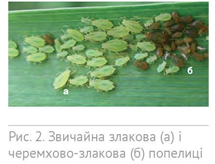 Черемхово-злакова попелиця яйцеподібної форми, завдовжки 2,4-2,5 мм, сіро-зелена, з іржаво-червоними плямами навколо трубочок, у білому обпиленні; довжина вусиків перевищує довжину тіла (рис. 2б). На початку червня мігрує з черемхи на злаки, зокрема й на кукурудзу. При масовому розмноженні попелиці живуть у пазухах листків, на їхній поверхні, качанах і волотях.