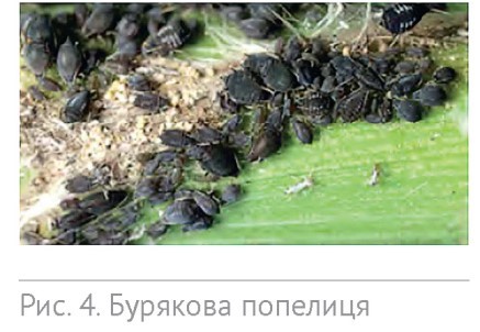 Бурякова попелиця завдовжки 1,8-2,5 мм, широкояйцеподібна, бура, чорно-зелена, матова, зі слабким восковим нальотом. Вусики і ноги блідо-жовті, з темними вершинами гомілок. Трубочки, хвостик і лапки чорно-бурі. Вусики трохи коротші за тіло (рис. 4). В Україні поширена повсюдно, поліфаг. Розвитку і розмноженню попелиць сприяє тепла з підвищеною вологістю погода. Попелиці оселяються колоніями на листках верхнього ярусу і на волотях. Під час їхнього живлення у рослинах порушуються процеси асиміляції і живлення, тканини в місцях пошкодження знебарвлюються, жовтіють і всихають. Дуже пошкоджені рослини пригнічуються, прив’ядають. Через пошкоджені ділянки легше проникають збудники хвороб, крім того, попелиці — переносники багатьох вірусних хвороб кукурудзи.