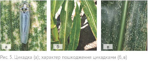 Крім попелиць, листя кукурудзи пошкоджують інші сисні комахи — цикадки. На рослинах кукурудзи цикадки трапляються протягом цілого літа, їхня чисельність зростає у період між збиранням ярих і появою сходів озимих хлібів. Характерні ознаки живлення цикадок на листках кукурудзи — дрібні білі кутасті плямки в місцях уколів, які зливаються і суцільно вкривають листки (рис. 5). Особливо потерпають від пошкодження цикадками молоді рослини кукурудзи пізніх термінів сівби під час посухи. Як і листкові попелиці, цикадки поширюють вірусні хвороби.