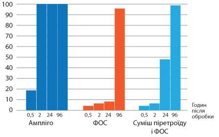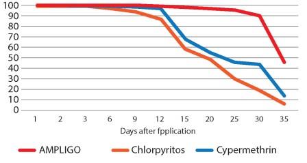 Ампліго — інсектицид контактно-кишкової дії, до складу якого входять дві діючі речовини: хлорантраніліпрол, 100 г/кг, та лямбда-цигалотрин, 50 г/кг. Хлорантраніліпрол потрапляє в організм комах контактно і через систему травлення. Діюча речовина зв’язується з ріанідиновими рецепторами, активуючи вивільнення і руйнування кальцієвих сховищ гладких і смугастих м’язів, ослаблює регуляцію м’язів, викликає параліч і загибель комах. Лямбда-цигалотрин, потрапляючи в організм шкідника, впливає на нервову систему: відкриває і не дає закритися натрієвим каналам, унаслідок чого змінюється звичний рух іонів натрію, що порушує передавання імпульсу (невимушеного перенесення електричного заряду). Ці особливості діючих речовин забезпечують контроль лускокрилих шкідників на кукурудзі на стадії гусениць усіх віків. Завдяки складникам в Ампліго є переваги над іншими інсектицидами, представленими на ринку України. Це передусім нокдаун-ефект, тобто висока початкова токсичність. Уже через дві години після внесення відбувається майже стовідсотковий контроль гусениць лускокрилих, тоді як в інших інсектицидів, зареєстрованих на кукурудзі, такі показники досягаються лише на другу-третю добу (рис. 6).