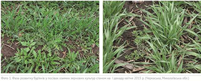 Передусім це залежність ефективності дії післясходових гербіцидів від температурного режиму. Хоча на багатьох продуктах і вказано, що мінімальна середньодобова температура, за якої їх можна застосовувати, +5°С, однак для досягнення максимального захисного ефекту вона має бути вищою за +10…+15°С. Якщо врахувати і те, що гербіциди мають обмеження із застосування щодо фази росту і розвитку культури та бур’яну, то строки їх внесення не завжди збігаються з оптимальним температурним режимом. Це ускладнює їх застосування і знижує ефективність. Прикладом є погодні умови весни 2015 року, коли підвищення середньодобової температури відбувалося досить повільними темпами та супроводжувалося значними перепадами температури. При цьому бур’яни біологічних груп ефемери, ярі рані, озимі та зимуючі, сходи яких з’явилися ще восени, активно вегетували (табл. 1 і фото 1). Внесення гербіцидів відбувалося у фазі початок виходу озимих зернових культур у трубку, коли дводольні бур’яни вже мали більше 4-6 листків, а середньодобова температура по регіонах була в межах +5…+10°С (ІІ-ІІІ декада квітня).