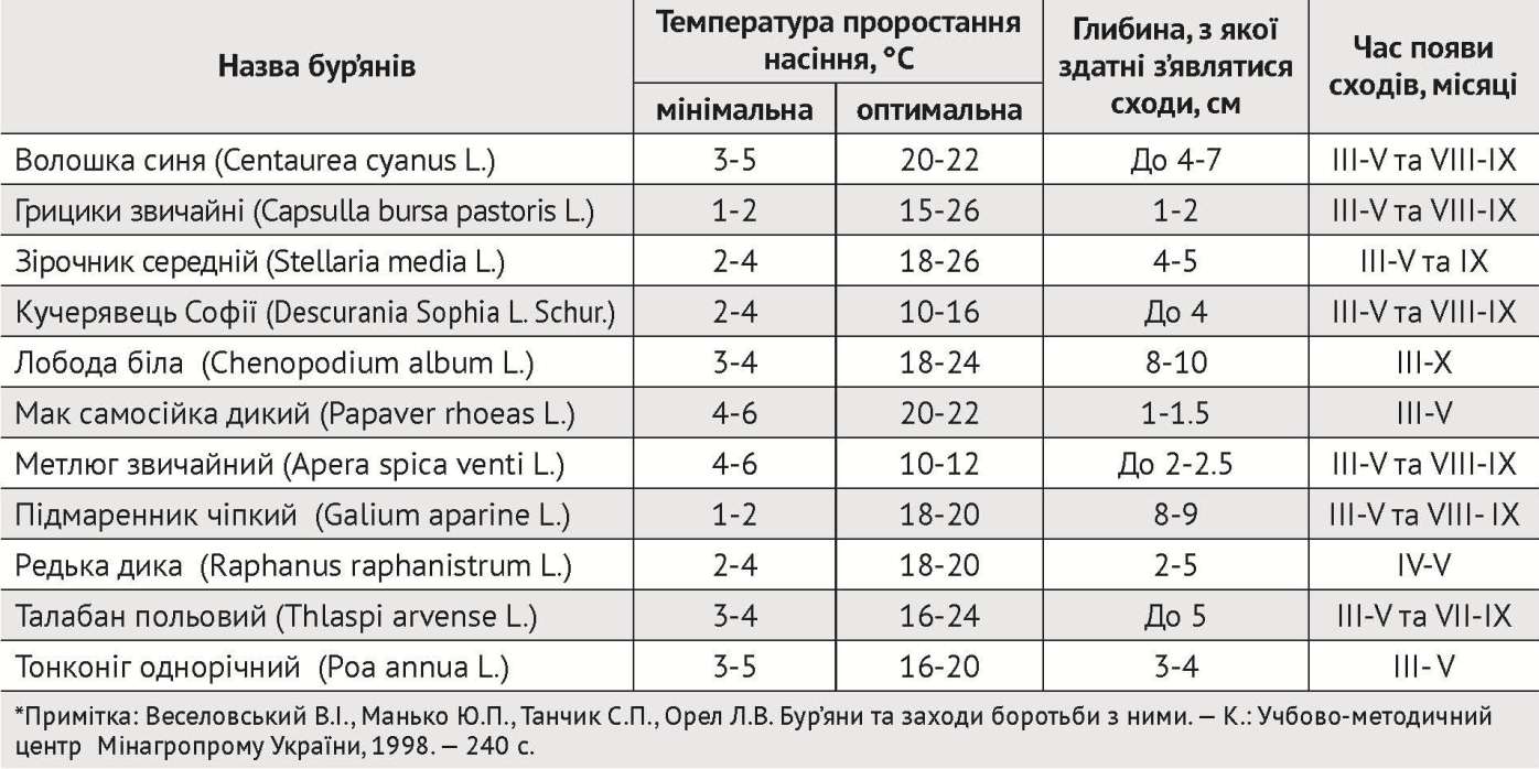 Таблиця 1. Вимоги до температурного режиму та строки появи сходів бур’янів*