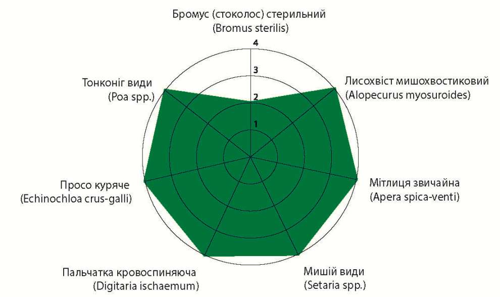 Перші сходи бур’янів у посівах озимої пшениці, ячменю, жита з’являються ще восени, під час появи сходів культури. Зазвичай видовий склад їх представлений групою ефемерів, озимих і зимуючих: зірочник середній, метлюг звичайний, талабан польовий, грицики звичайні, суріпиця озима, волошка синя, ромашка непахуча, підмаренник чіпкий, мак дикий, злинка канадська, кучерявець Софії, редька дика та інші. «Асортимент» доволі широкий, і здатність бур’янів виживати в критичних умовах на порядок вища, ніж у культурних рослин, тому ефективний захист посівів від них потрібен вже восени. Саме такий підхід успішно використовується у багатьох країнах Західної Європи, а також останніми роками набуває популярності в аграріїв західних, північних та центральних регіонів України.