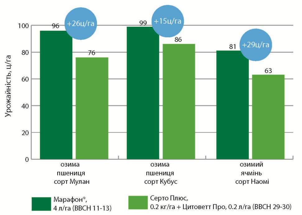 Використання гербіциду Марафон® поряд з ефективним контролем однорічних дводольних і злакових бур’янів забезпечує низку переваг, зокрема: