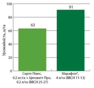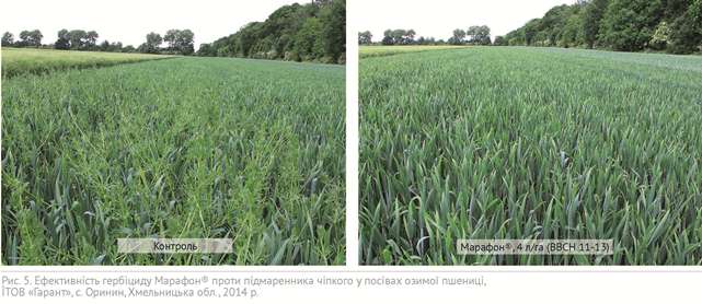 На користь осіннього внесення гербіцидів свідчать і показники урожайності озимих зернових культур. Так, у ТОВ «Гарант» с. Оринин Хмельницької області декілька років поспіль використання гербіциду Марафон® забезпечує на 15-30% вищу урожайність у порівнянні з традиційною системою захисту від бур’янів (рис. 4-6).