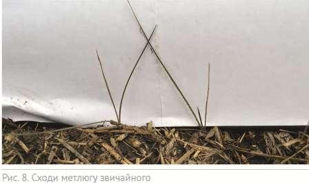 Визначити бур’ян по сходах з осені. У метлюгу звичайного перший листок дуже вузький, тонкий, майже ниткоподібний, яскраво-зелений, завдовжки 15-20-30 мм, завширшки близько 0,5 мм, у нижній частині плоский, за шириною майже однаковий по всій своїй довжині і лише біля самого кінчика звужений, гоструватий. Пластинка другого листа схожа на перший, але довша (рис. 8).