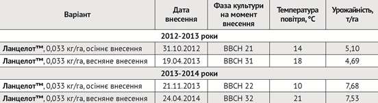 Таблиця 1. Результати досліджень з осіннього застосування Ланцелот™