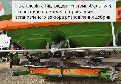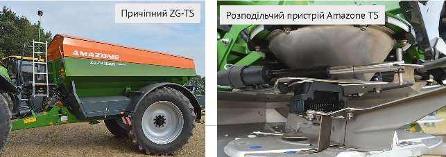 ZG-TS оснащений новим, виготовленим із нержавіючої сталі, розподільчим пристроєм Amazone TS із гідравлічним приводом, який дозволяє вносити добрива на швидкості до 30 км/год. в нормі до 650 кг/хв. (10,8 кг/с), покриваючи при цьому 54 м. Внесення потрібної норми по краях полів без заміни дисків забезпечують системи Auto TS та Argus Twin (детальніше в АС №13 (356), а на клинах — функція посекційного вмикання (128 секцій) DynamicSpread.