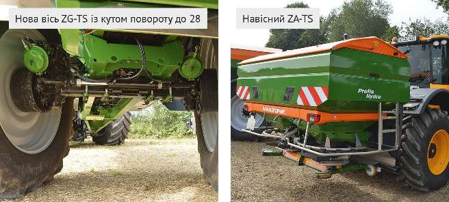 Помітною рисою ZG-TS є спеціальна вісь, яка завдяки програмному забезпеченню ISOBUS тримає розподільник точно в колії, автоматично підрулюючи в межах максимального кута повороту в 28˚.