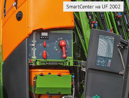 Та головною новинкою стала система керування SmartCenter, яка розташована на правому боці обприскувача та захищена від потрапляння розчину й бруду великими відкидними дверима. На панелі управління розташований запатентований Amazone семиходових напорний вентиль, який працює за принципом клапанної дії та полегшує керування машиною. UF 2002 оснащений новим конічним баком для промивання об'ємом 60 л, який забезпечує швидке (200 л/хв.), безперебійне заповнення і таке ж очищення.