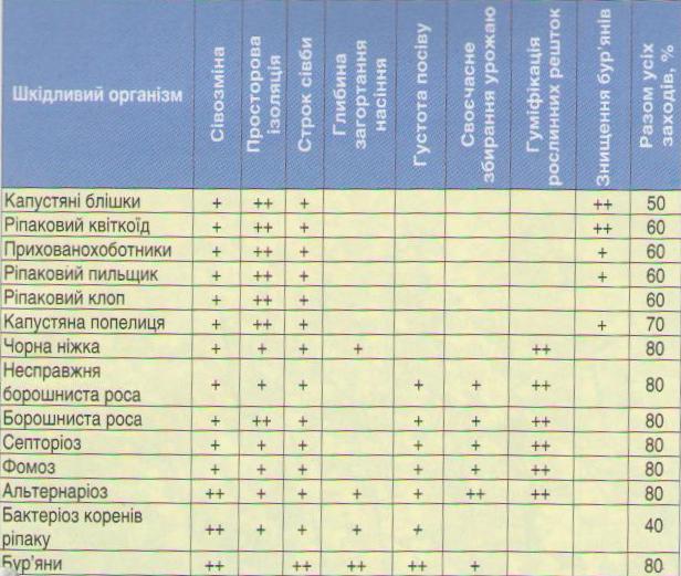 Технічна ефективність запобіжних заходів проти чорноїніжки,несправжньої борошнистої роси, борошнистої роси, септоріозу, фомозу,альтернаріозу та бактеріозу коренів ріпаку досягає 80%; проти ріпаковогоквіткоїду, прихованохоботників, ріпакового пильщика, ріпакового клопата капустяної попелиці - 60-70%; проти стовбура ріпаку та капустянихблішок - 40-50% (див. табл. 3).
